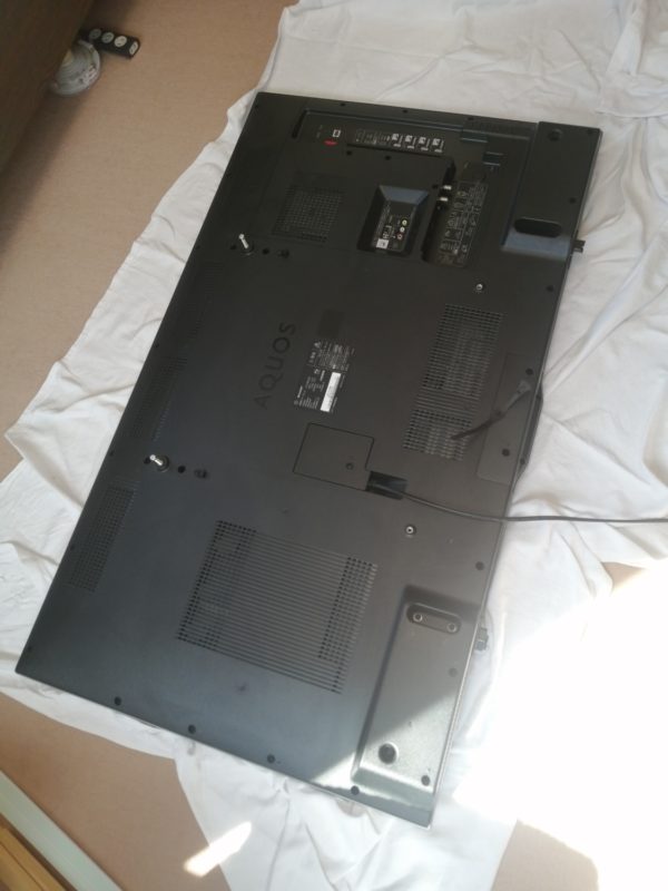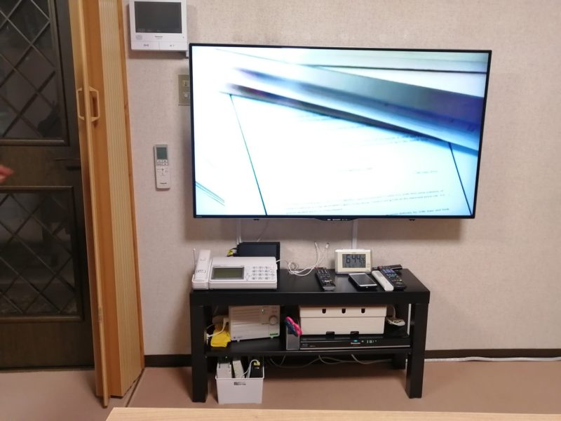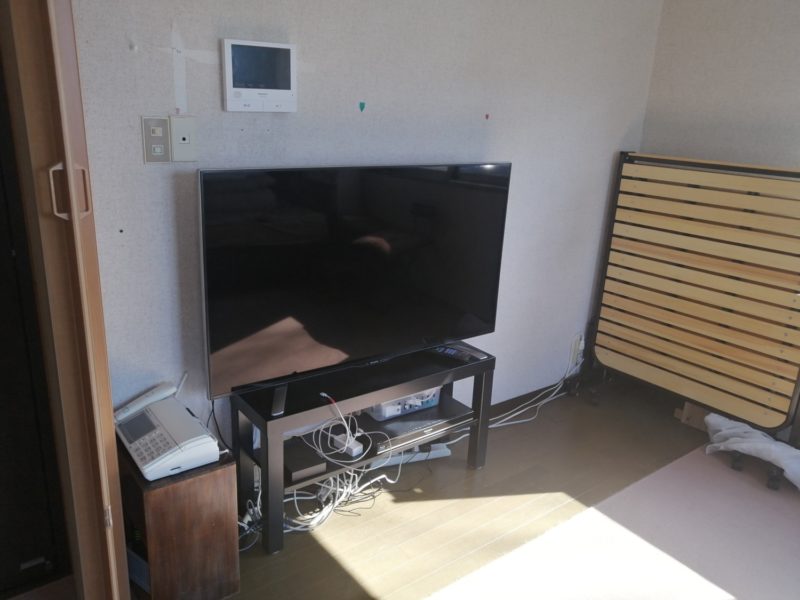 大きいテレビ台をのけて、持参していた薄型のテレビ台(IKEA製)に移動 ( テレビを壁掛けにしても小さなテレビ台は必須です。どうしてもテレビアンテナ線・電源・ケーブルやブルーレイレコーダー・などの置き場が必要なため)